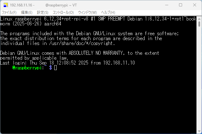 RaspberryPiコマンドプロンプトが表示され、使用可能となる。