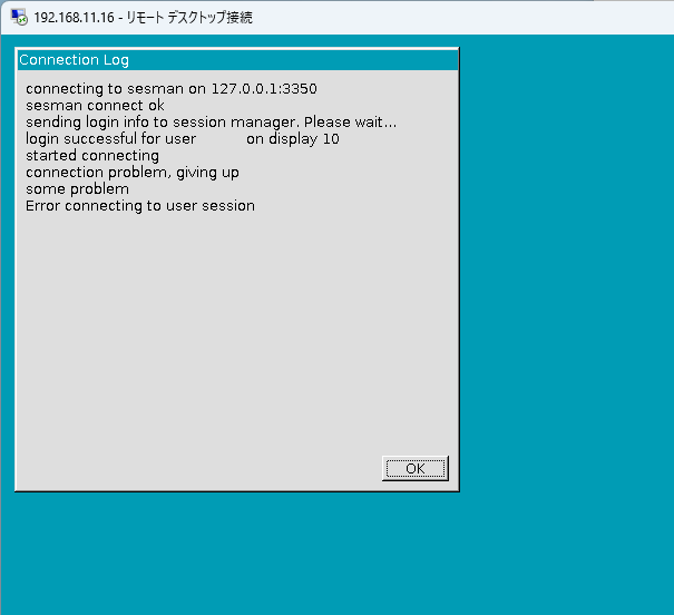 そしてログインはできますが、ブルースクリーン上にカーソルが動くだけで何も表示されません。その後数分経って上の画像のように接続エラー表示になります。